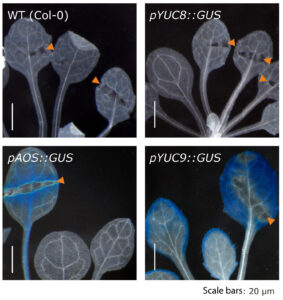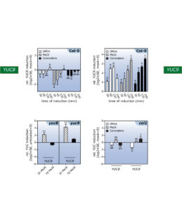 In this context, the aim of our lab is to shed light on the mechanistic and conceptual crosstalk between auxin and oxylipins, in particular between indole-3-acetic acid and jasmonic acid; two plant hormones that, at first glance, appear to have not much in common. In previous studies, taking an microarray approach, we identified two YUCCA genes, YUC8 and YUC9, to respond differentially to a treatment with methyl jasmonate (Fig. 2).