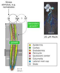 At the moment, our lab is trying to unravel both the molecular mechanism that mediate jasmonate-auxin crosstalk and the function of this relationship in physiological terms. Currently, we are undertaking microarray assays and directed plant hormone quantification experiments to verify our actual working-hypothesis that wounding initiates a signaling cascade, including the crosstalk between jasmonate, auxin, and ethylene, to answer mechanical stress or wounding by, e.g., blocking cell elongation and enforcing secondary cell wall growth (Fig. 4).