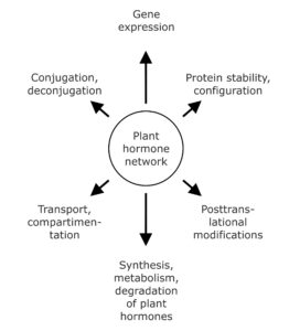 Figure 1. The plant hormone network affects plant development on several different levels. A plethora of different physiological and biochemical processes constitute possible targets of phytohormone action. They reach from the regulation of gene expression and protein abundance over posttranslational modifications of proteins and the influence of plant hormone homeostasis by affecting synthesis, metabolism, and conjugation of signaling compounds to the impact on hormone transport and compartmentation.